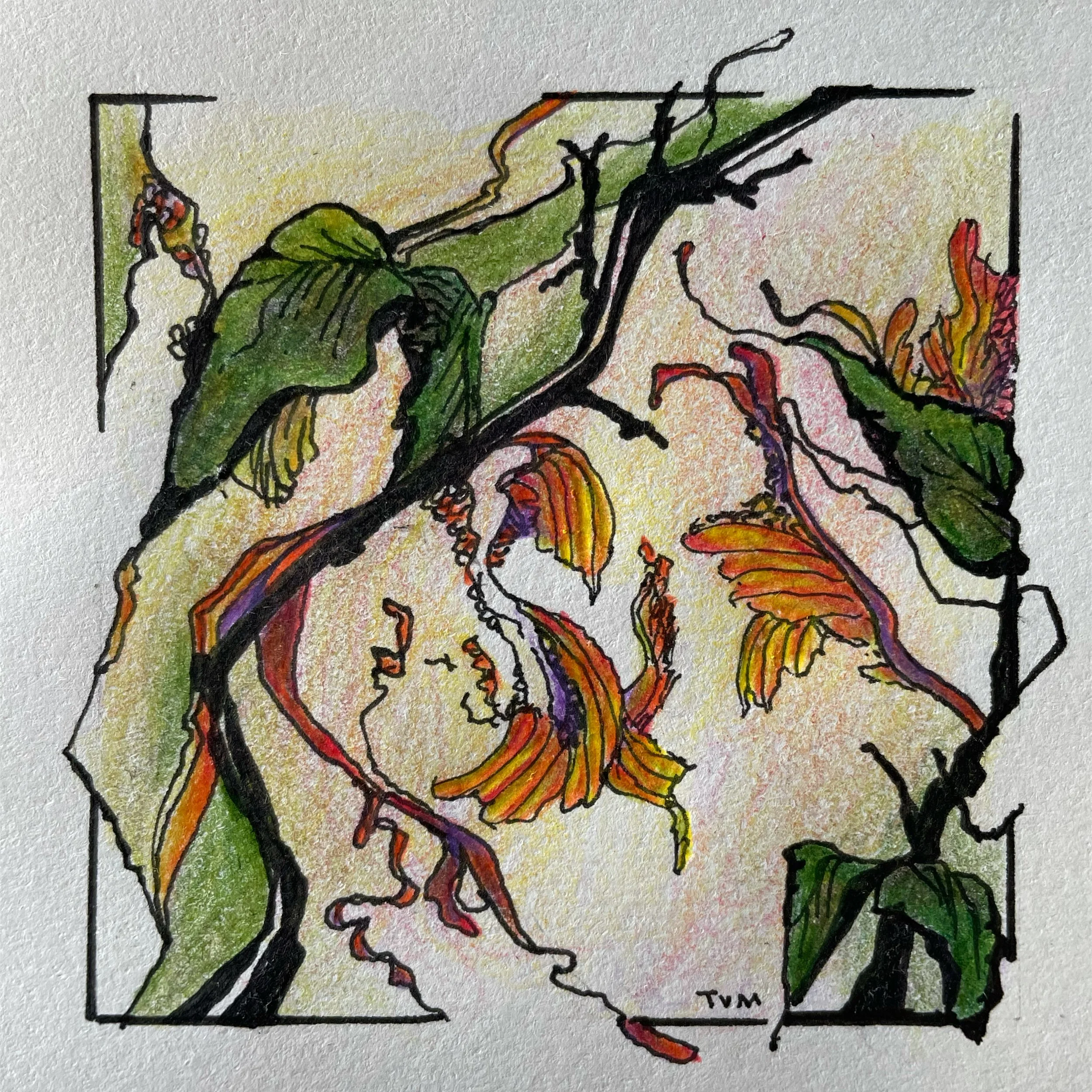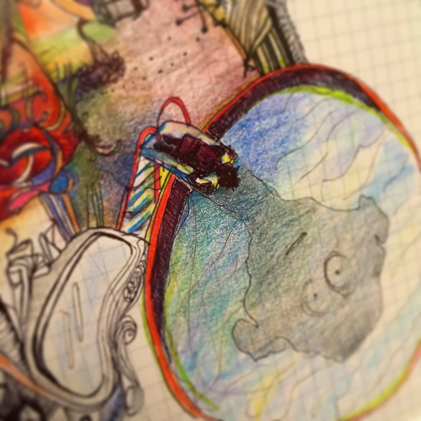 My approach to composition and storytelling is simple. In every composition, Iām conscious of light sources and color palettes. I look for ways to create depth and tension through movement, and am intentional in use of negative space. (Shown: Prismacolor pencil, ink, mixed media collages, and risograph prints.)